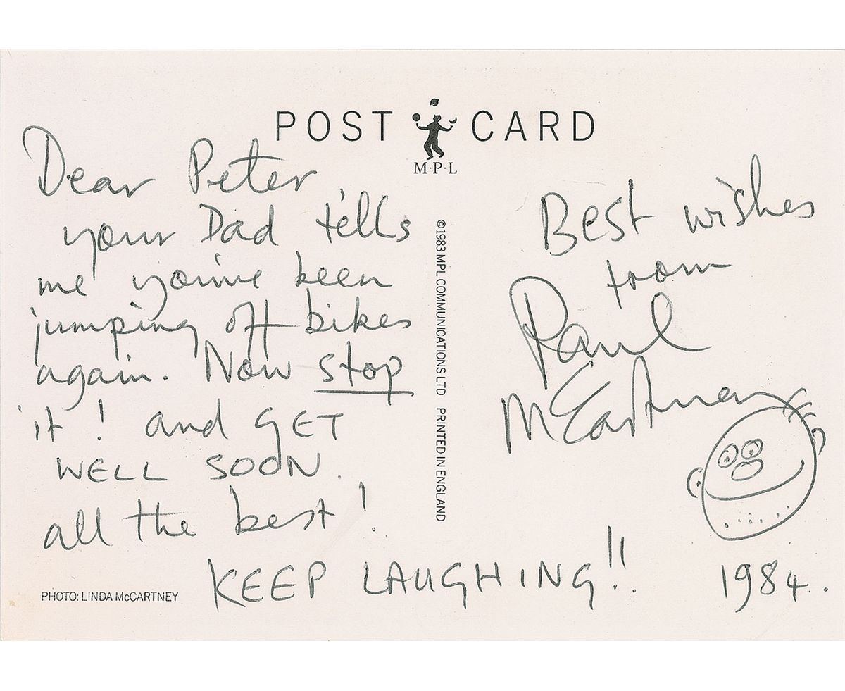 ALS signed “Paul McCartney,” on a 6 x 4 MPL photo postcard of McCartney, bearing a pre-printed signature on the front, 1984. Letter to a boy recovering from a broken wrist. In full: “Your Dad tells me you’ve been jumping off bikes again. Now stop it! and get well soon. All the best! Keep laughing!!” Under his signature McCartney has added a small sketch of a smiling man. In fine condition. Accompanied by a letter of provenance from the father of the original recipient.