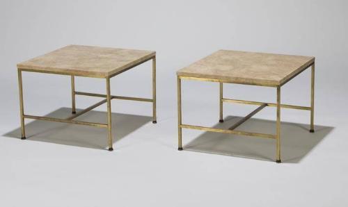 <b>Description: </b>Pair of Irwin Collection end tables with travertine tops ; Calvin
