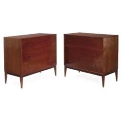 Paul McCobb Planner Group cabinets, pair, by Winchendon, with hanging vanity center (not shown), maple, each with three drawers with original brass pulls, vanity with lift-up top and mirror, original finish, signed, 36”w x 18.25”d x 33.5”h, good condition