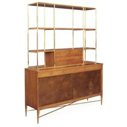 Paul McCobb buffet with breakfront, by Calvin, mahogany, sideboard with leather-covered sliding doors below three drawers, square tubular brass cross-stretcher to base, removable hutch with mahogany shelves and four drawers in a square tubular brass frame