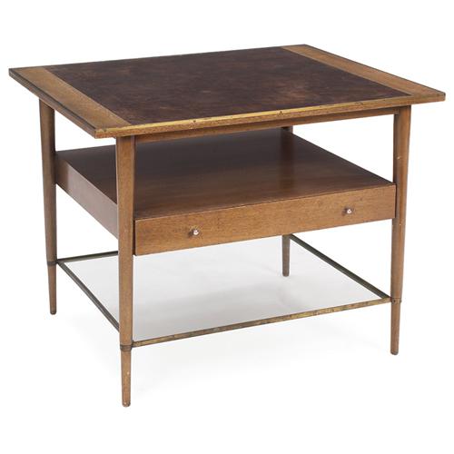 Paul McCobb end table, by Calvin, mahogany frame with one drawer and original inset leather to top, brass stretchers to base support glass shelf, 32"w x 26"d x 24.5"h, very good condition
