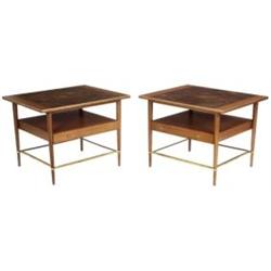 Paul McCobb end tables/nightstands, by Calvin, mahogany frames with one drawer each and original inset leather to tops, brass stretchers to base support glass shelf, metal tag, original finish, very good condition, 21”w x 21”d x 24”h, one drawer each