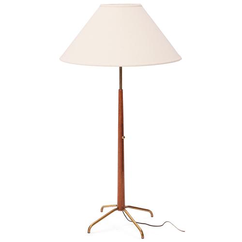Paul McCobb floor lamp, mahogany standard over a four-prong brass base, height adjusts via brass knob and mechanism on standard, plastic diffuser under shade, uses three bulbs, unmarked, shade replaced, 28"dia. x 54"h, very good condition