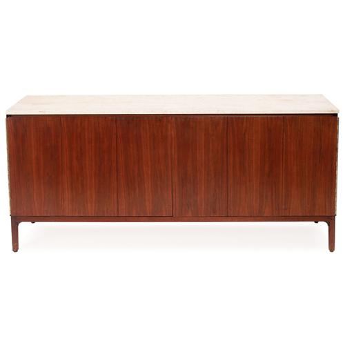 Paul McCobb sideboard, by Calvin,walnut case with a travertine top and trifold doors, original foinish, marked with metal tag,71in.w x 19in.d x 32in.h,very good condition
