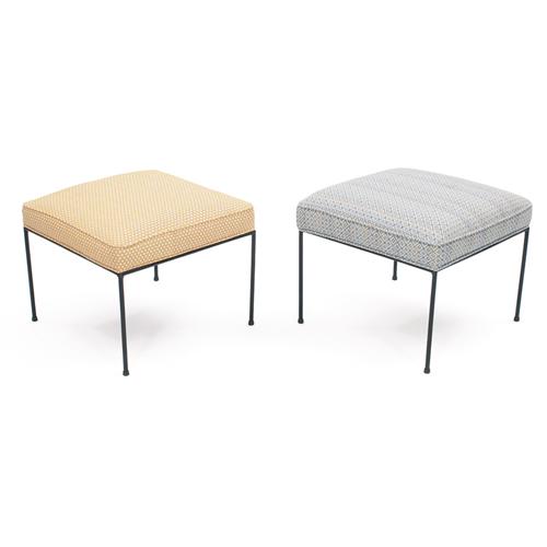 Paul McCobb stools, pair, by Winchendon, upholstered seats over black iron legs, original finish,17.5in.w x 20in.d x 20in.h,very good condition