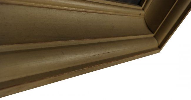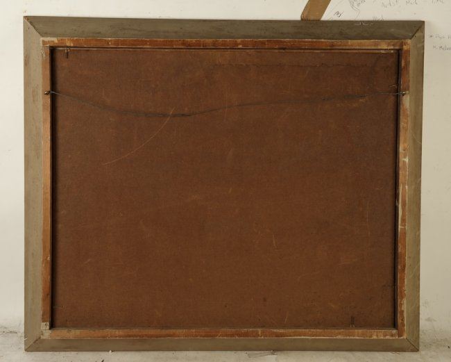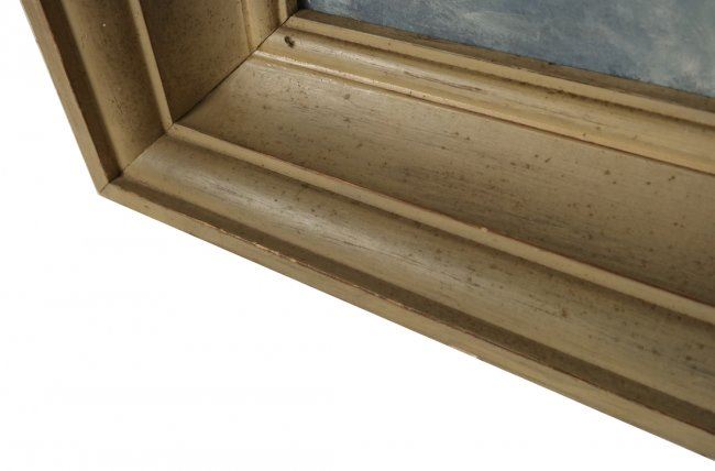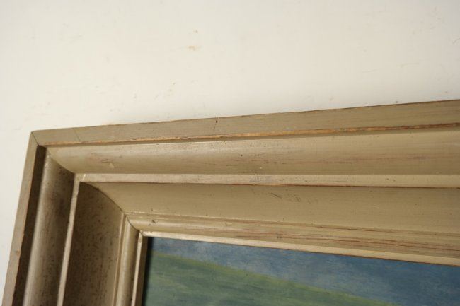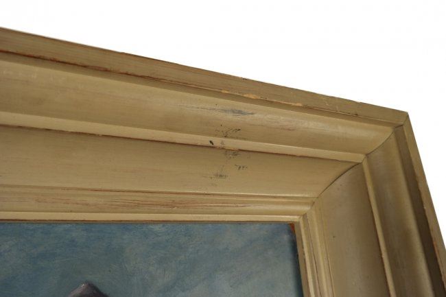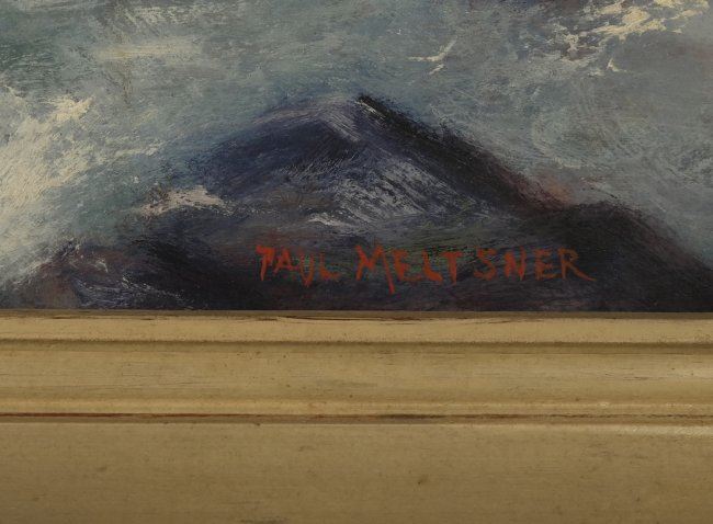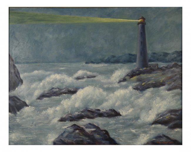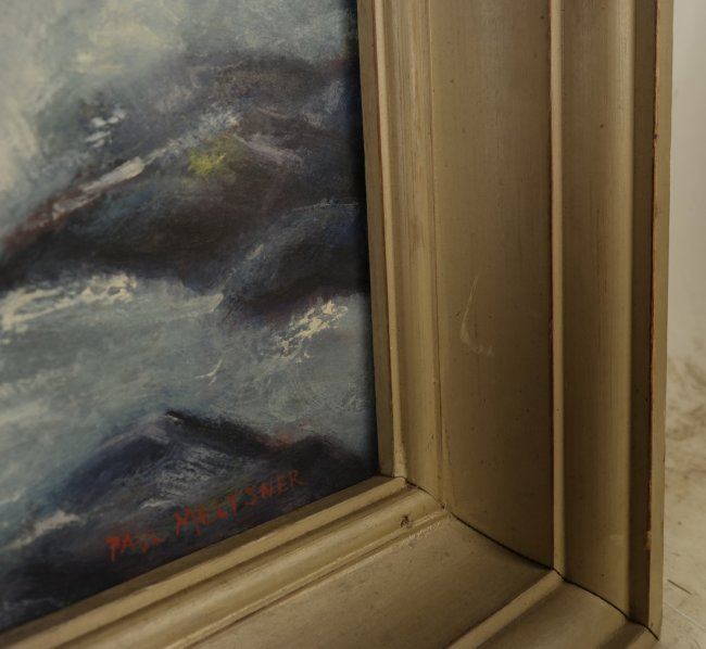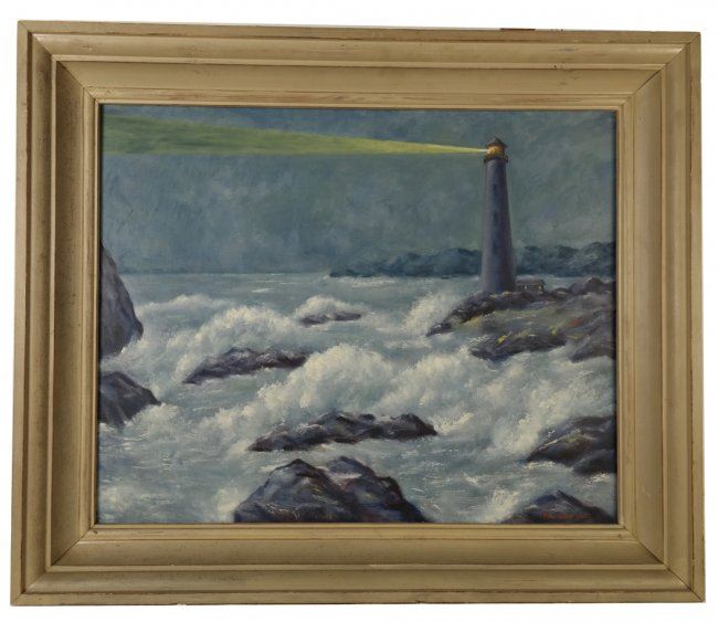 Framed painting depicts a rocky shoreline with lighthouse. Signed lower right Paul Meltsner. [Art: 23" x 29"; Frame: 30 1/2" x 36 1/2"]. Good condition with numerous scratches and chips to painted frame.