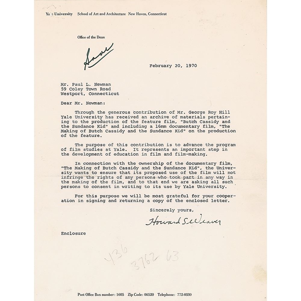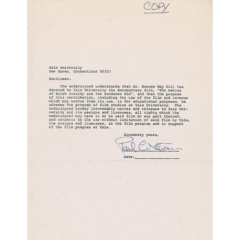 DS, signed “Paul L. Newman,” one page, 8.5 x 11, no date but circa 1970. In part: "The undersigned understands that Mr. George Roy Hill has donated to Yale University the documentary film, 'The Making of Butch Cassidy and the Sundance Kid,' and that the purpose of this contribution, including the use of the film and revenue which may accrue from its use, is for educational purposes, to advance the program of film studies at Yale University." The document is marked "Copy" at the top, but has been authentically signed in blue ballpoint by Newman. In fine condition. Accompanied by the original letter on the subject sent to Newman by Howard S. Weaver, dean of the Yale University School of Art, dated February 20, 1970.