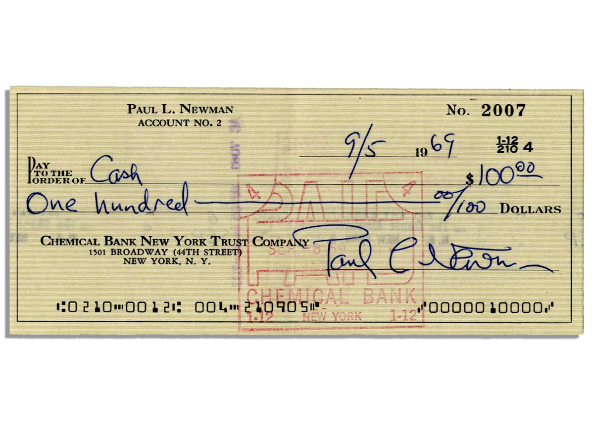 Paul Newman signed check from 1969, the year he starred as Butch Cassidy in the classic ''Butch Cassidy and the Sundance Kid''. Check printed with his name is signed, ''Paul L. Newman'' in blue ink, dated 5 September 1969 and made out to ''Cash'' in the amount of $100.00. Measures 6.25'' x 2.75''. Standard bank cancellations. Near fine.