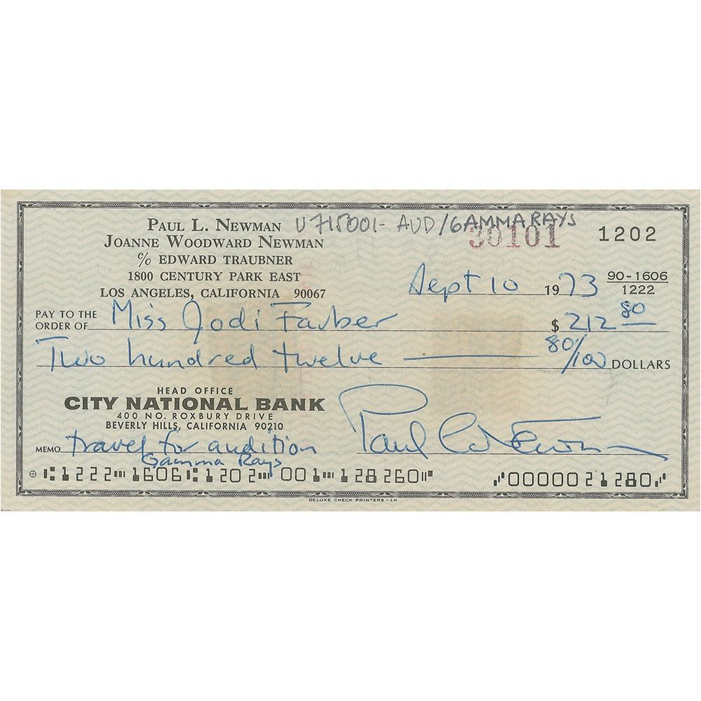 Personal check, 6 x 2.75, filled out and signed by Newman, "Paul L. Newman," payable to Miss Jodi Farber for $212.80, September 10, 1973, for "travel for audition, Gamma Rays." In fine condition, with light show-through from two tape stains on the reverse.