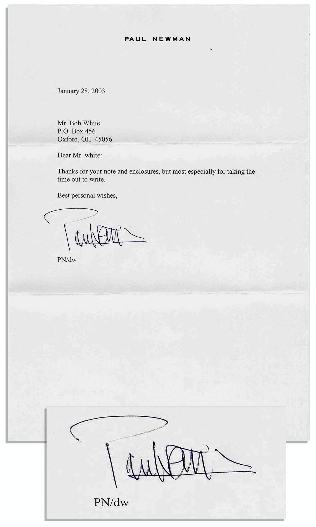 Paul Newman Typed Letter Signed on His Personal Letterhead -- 28 January 2003 -- 7'' x 10.5'' -- Accompanied by Mailing Envelope