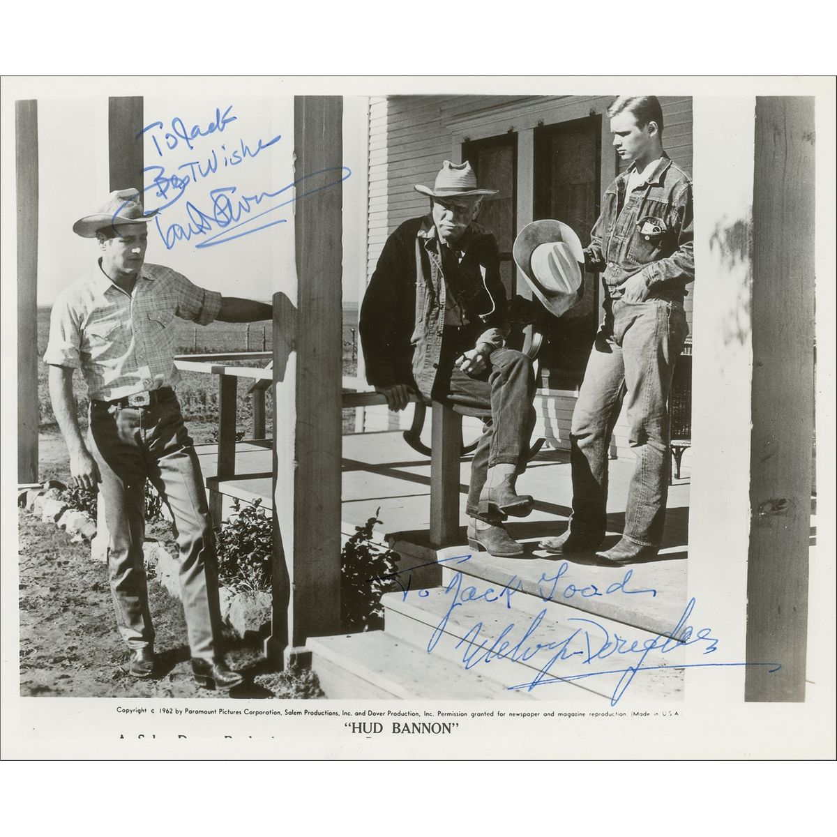 Glossy 10 x 8 photo of the pair in Hud Bannon, signed and inscribed in blue felt tip “To Jack, Best wishes, Paul Newman,” and “To Jack Good, Melvyn Douglas.” In fine condition, with a couple trivial creases and a bit of irregular adhesion to Douglas’s signature.
