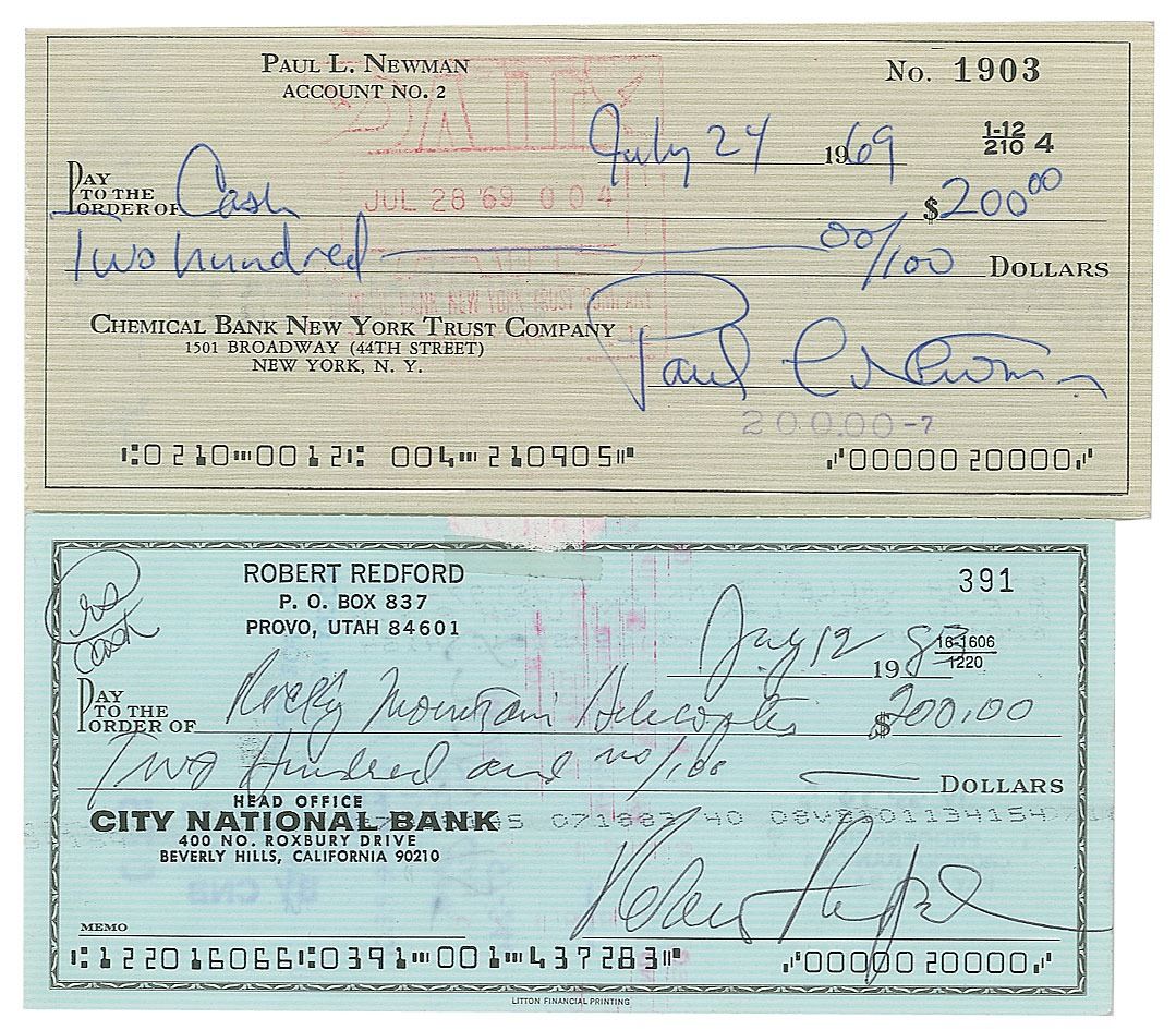Two checks: a personal check, 6.25 x 2.75, filled out and signed by Newman, "Paul L. Newman," payable to cash for $200, dated July 24, 1969; and a personal check, 6 x 2.75, filled out and signed by Redford, "Robert Redford," payable to Rocky Mountain Helicopters for $200, dated January 12, 1983. In overall fine condition.