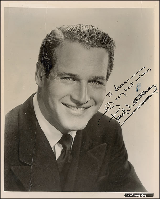 Vintage glossy 8 x 10 photo, signed and inscribed in fountain pen “To Susan—with very best wishes, Paul Newman.” Scattered creasing, with a noticeable vertical crease to left side, light wrinkling and creasing, a few stray ink marks at end of signature, and mounting remnants on reverse, otherwise very good condition.