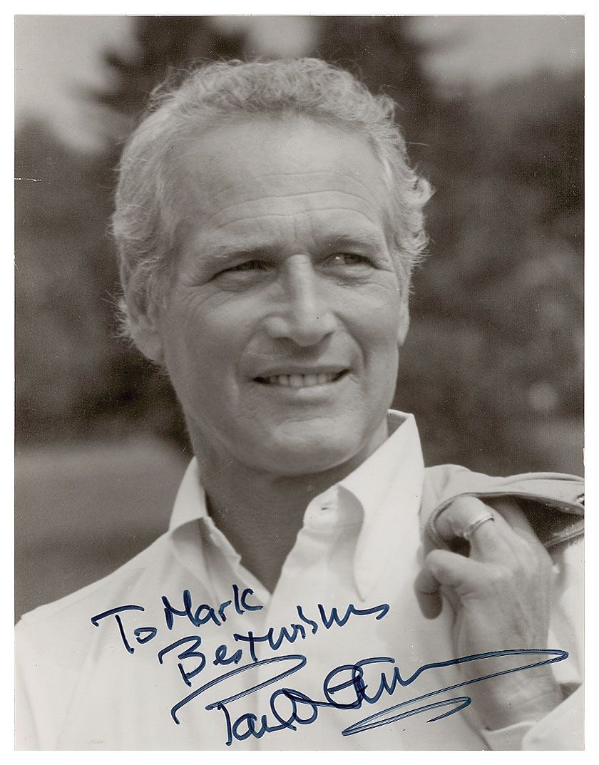 Glossy 7 x 9 photo of Newman with his jacket slung over his shoulder, signed and inscribed in black felt tip “To Mark, Best wishes, Paul Newman.” In very good condition, with trimmed edges, scattered creases and impressions, and some surface loss and adhesive remnants to reverse.