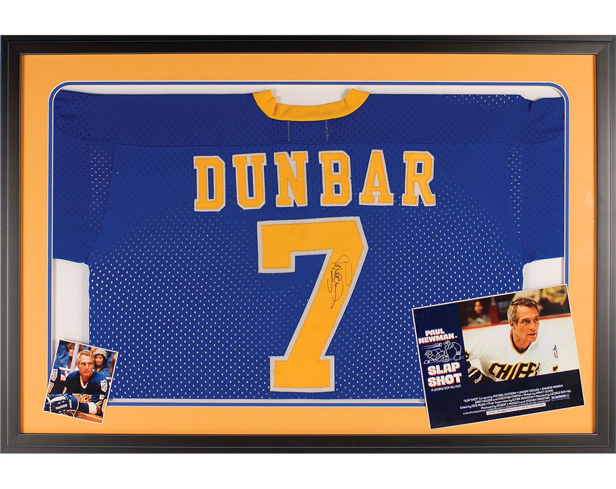 Replica Charlestown Chiefs #7 hockey jersey, with sewn on letters and numbers, signed in black felt tip on the number on the back. Double matted and framed with two photos of Newman from Slapshot to an overall size of 36 x 24.5. In fine condition. Accompanied by a notarized letter of provenance from the original recipient detailing how the signature was acquired on May 28, 2005, at a pre-race sponsorship dinner. Oversized.