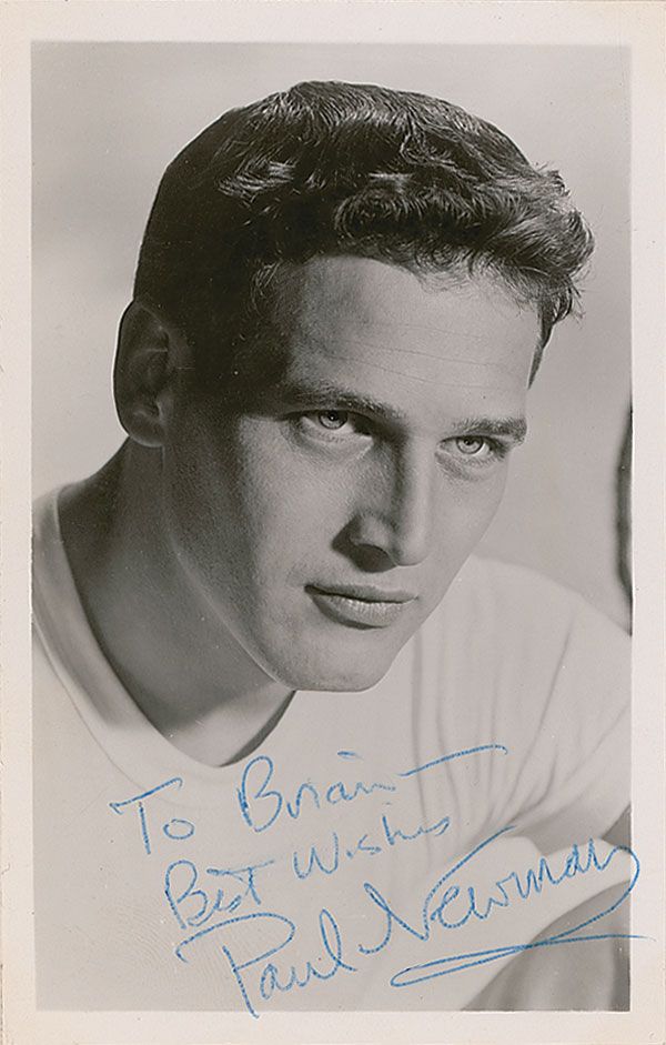 Handsome vintage glossy 3.5 x 5.5 postcard photo, signed and inscribed in blue ballpoint “To Brian—Best wishes, Paul Newman.” In fine condition, with a few scattered light surface marks.