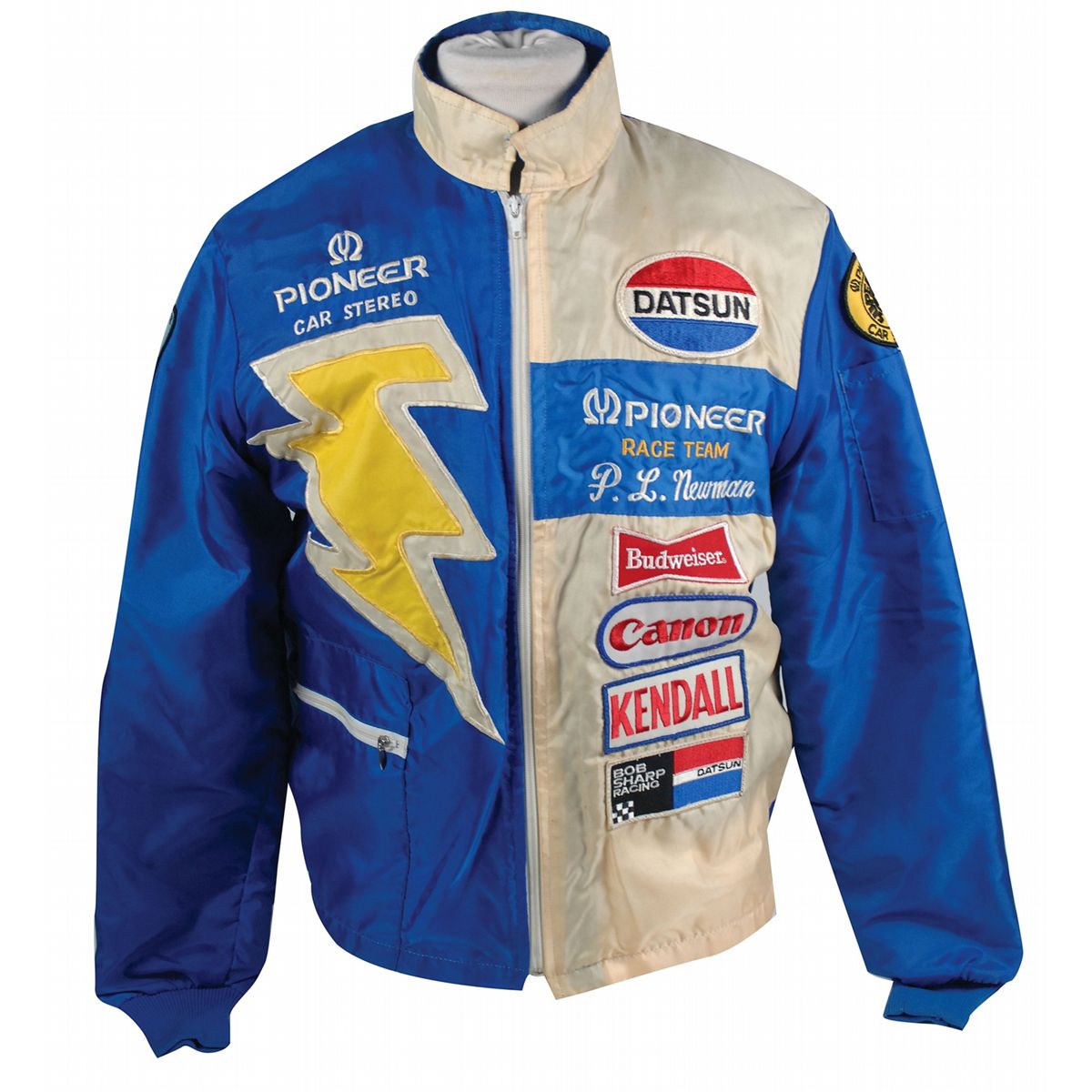 Newman’s personally owned and worn Bob Sharp Racing jacket manufactured by Crown, size small, embroidered with Newman’s name and bearing various sewn sponsor patches, including Datsun, Budweiser, Canon, Pioneer, and Kendall. In fine condition. This item is not signed. The jacket was originally purchased at a 1982 celebrity charity auction in Oxnard, CA. Accompanied by two color copies of photos of Newman in this exact jacket, standing in front of a large crowd at an IMSA race in May of 1981 at Laguna Seca Raceway in Monterey, California. A fantastic chance to own an essential, and well-documented piece of clothing from this talented actor and race car driver.