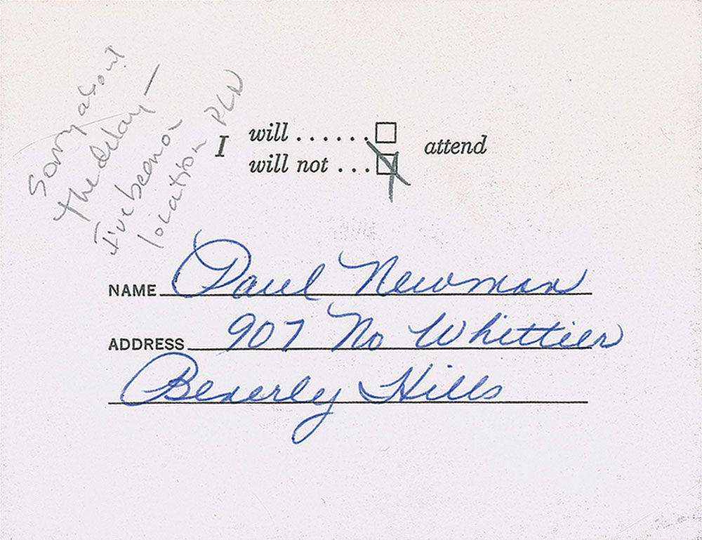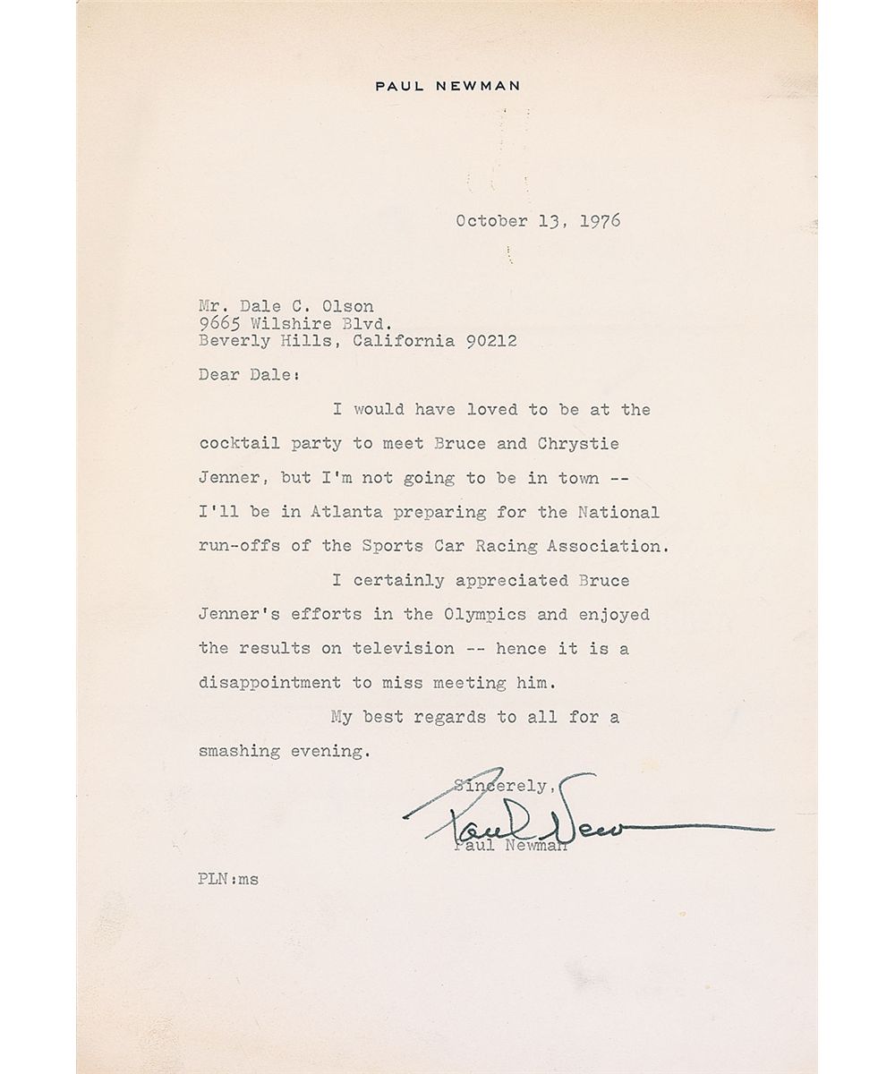 RSVP card, 4.25 x 3.25, for a cocktail party for Bruce and Chrystie Jenner in 1976 after Jenner won the decathlon, with Newman’s name and address written in an unknown hand, with a short note in pencil by Newman in the upper left stating, “Sorry about the delay—I’ve been on location. PLN.” In fine condition. Accompanied by a TLS declining the invitation, bearing a secretarial signature.