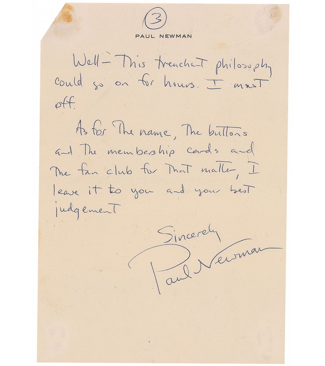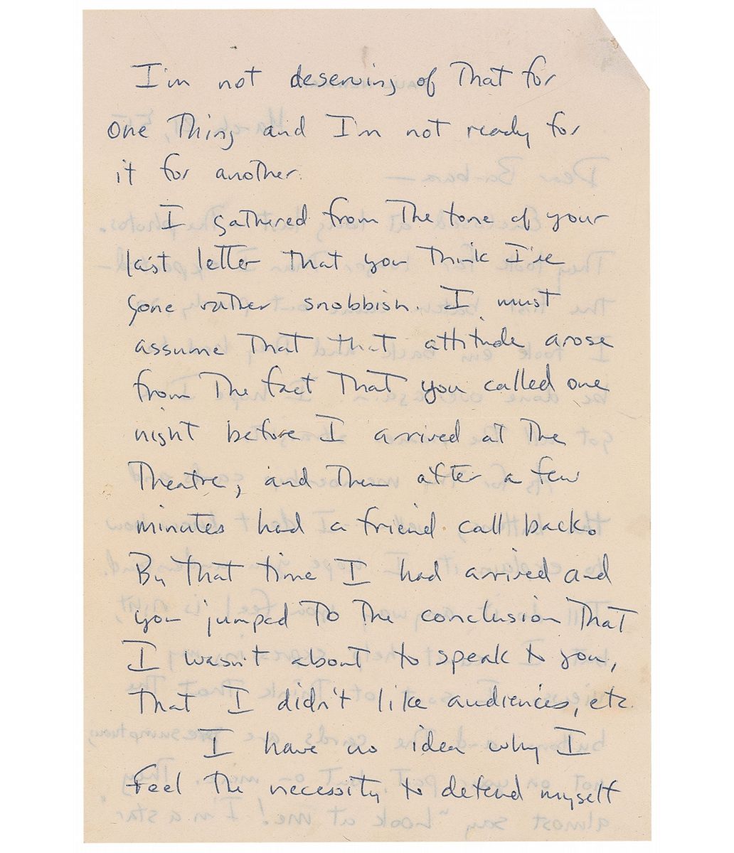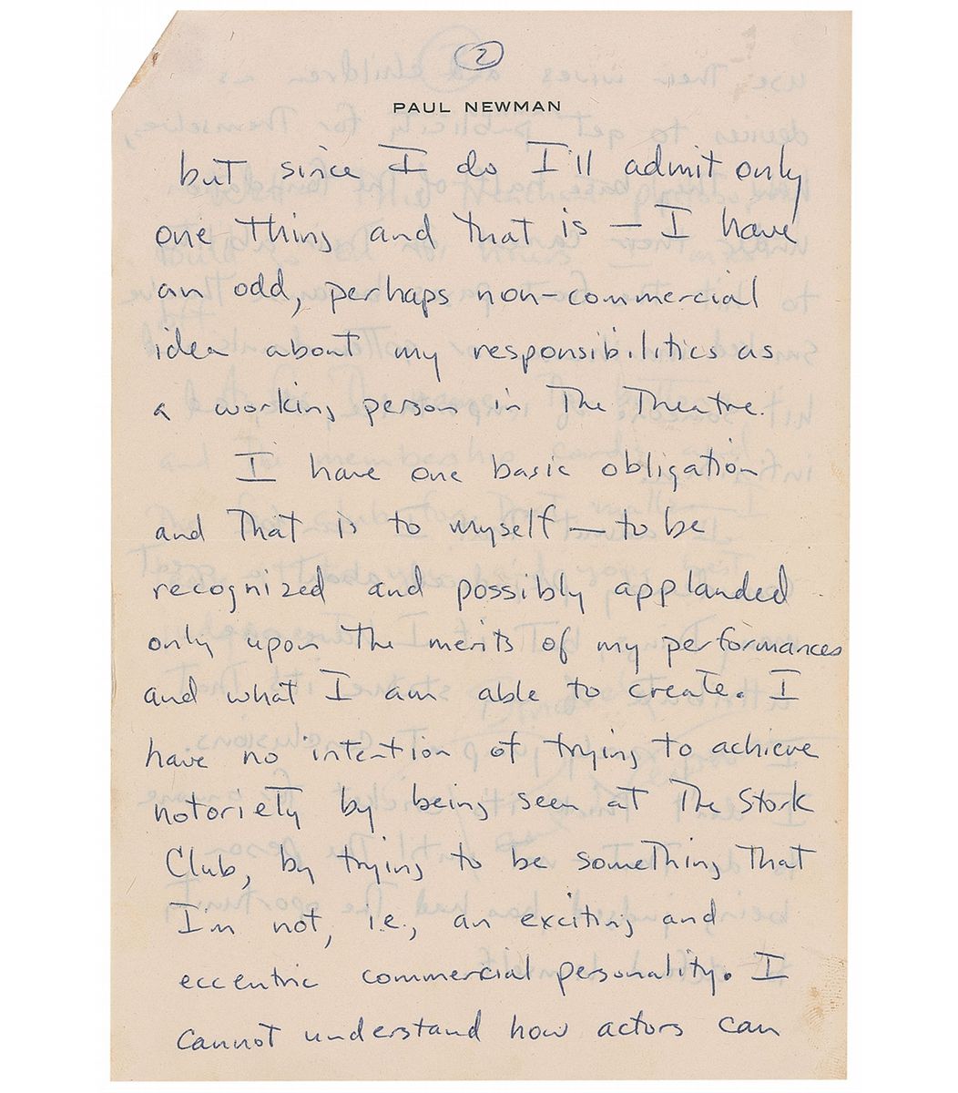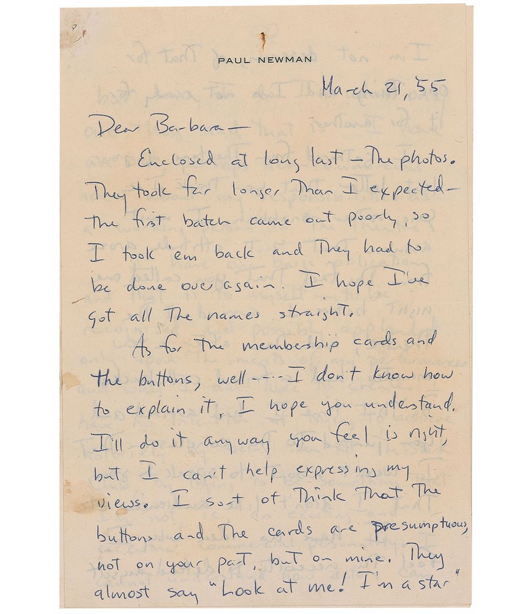 ALS, three pages both sides, 6.25 x 9, personal letterhead, March 21, 1955. Letter to one of the founders of his fledgling fan club, Barbara Rushmore. Newman tries to relay the fact that he does what he does for himself. In part, “As for the membership cards and buttons…I sort of think the buttons and cards are presumptuous, not on your part, but on mine. They almost say, ‘Look at me! I’m a star.’ I’m not deserving of that for one thing and I’m not ready for it for another…I have no idea why I feel the necessity to defend myself but since I do I’ll admit only one thing and that is—I have an odd, perhaps non-commercial idea about my responsibilities as a working person in the theatre. I have one basic obligation and that is to myself—to be recognized and possibly applauded only upon the merits of my performances and what I am able to create. I have no intention of trying to achieve notoriety by being seen at the Stork Club, by being something that I am not, i.e., an exciting and eccentric commercial personality. I cannot understand how actors can use their wives and children as devices to get themselves publicity for themselves…on their ability to hit the front pages because they’ve smoked marihuana [sic] or gotten drunk and hit someone of importance, etc, ad infinitum.” Accompanied by a vintage matte-finish 5 x 7 close-up photo of Newman, and an original glossy 4.75 x 6.75 photo of Rushmore that she sent to Newman of her in a cheesecake pose wrapped in just a towel, with her personal stats written on the back. In fine condition, with a staple hole to top left corner.