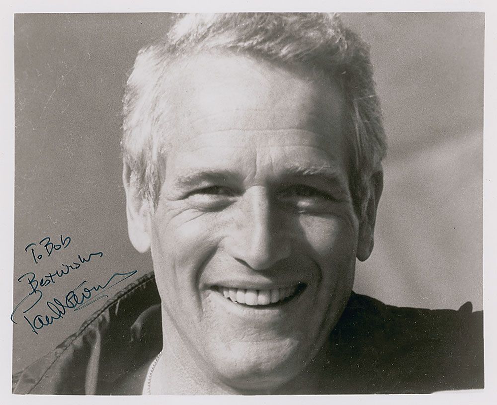 Uncommon glossy 10 x 8 close-up photo of the philanthropic actor, signed and inscribed in black felt tip, “To Bob, Best wishes, Paul Newman.” In fine condition.