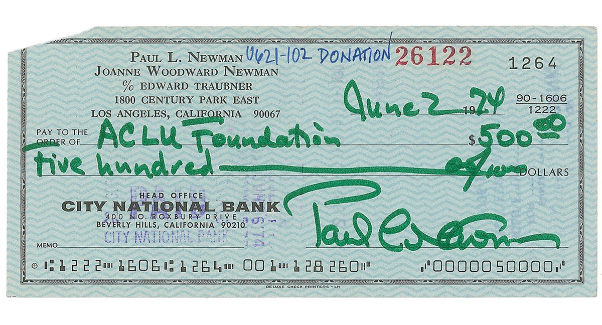 Personal check, 6 x 2.75, filled out and signed by Newman, “Paul L. Newman,” payable to ACLU Foundation for $500.00, June 2, 1974. In fine condition, with a central vertical fold, expected stamps and notations, and missing top left corner tip.