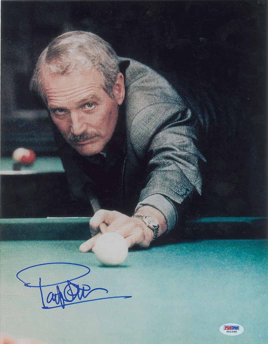 Color glossy 11 x 14 photo of Newman in his Oscar-winning turn as Fast Eddie Felson in the 1986 film The Color of Money, signed in blue felt tip. In fine condition, with an expected slightly grainy quality to the image and a PSA/DNA label affixed to lower right corner.
