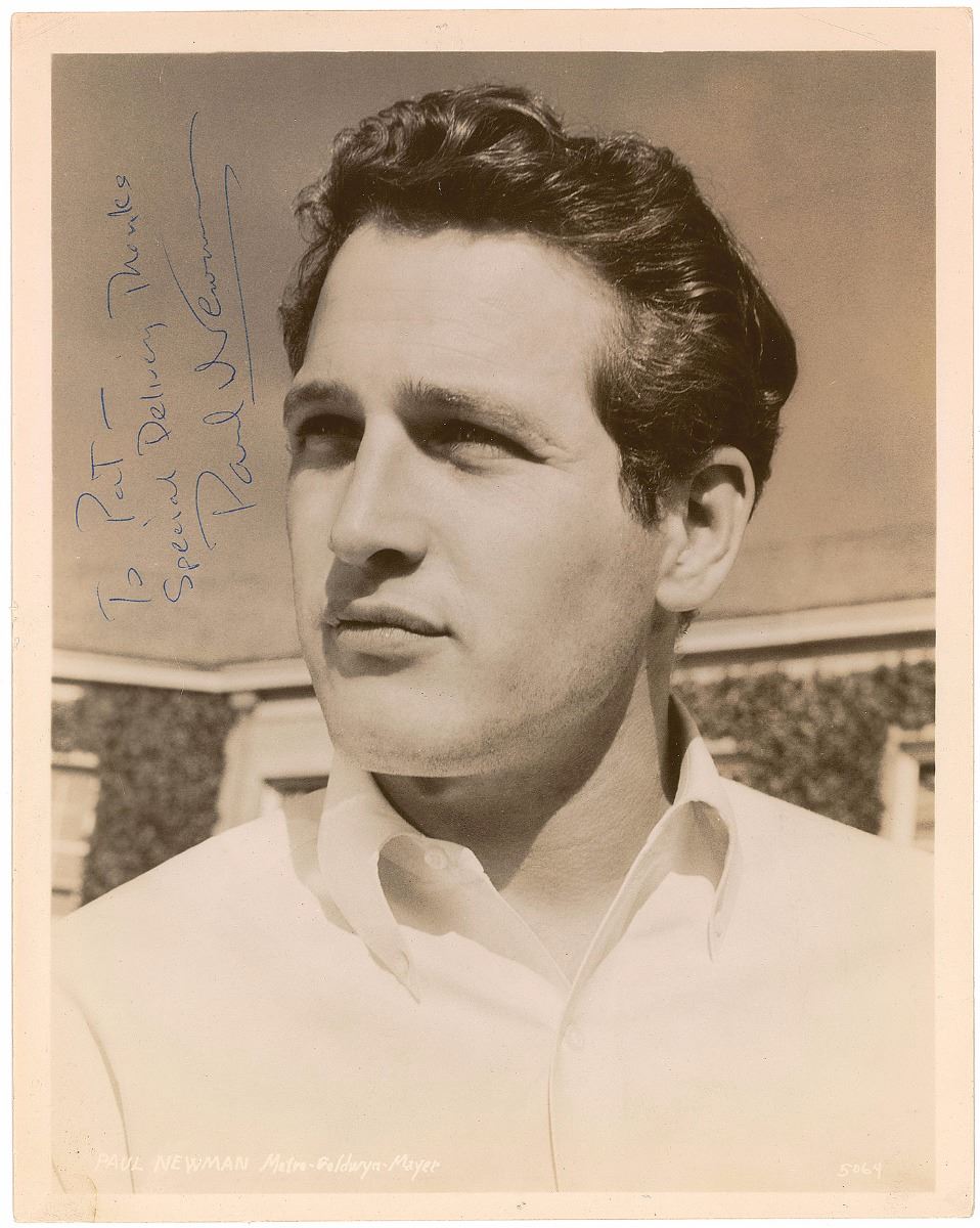 Vintage glossy 8 x 10 Metro-Goldwyn-Mayer publicity photo of Newman in a collared shirt, vertically signed and inscribed in blue ballpoint, “To Pat—Special Delivery Thanks, Paul Newman.” In fine condition, with pinholes to borders and scattered light creasing.