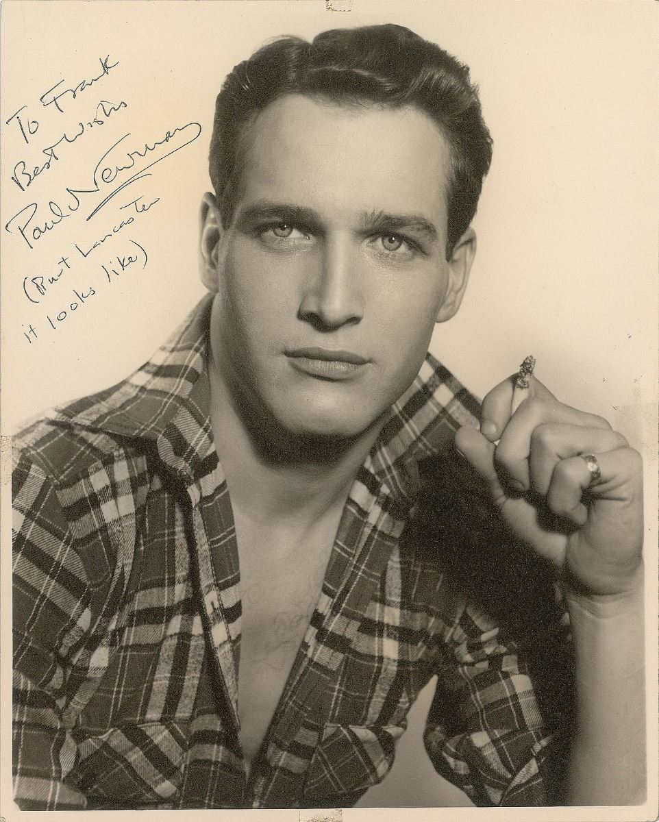Striking vintage matte-finish 8 x 10 photo of a young Newman smoking a cigarette, signed and inscribed in black ballpoint, “To Frank, Best wishes, Paul Newman (Burt Lancaster it looks like).” In fine condition, with small areas of tape residue in top and bottom borders.