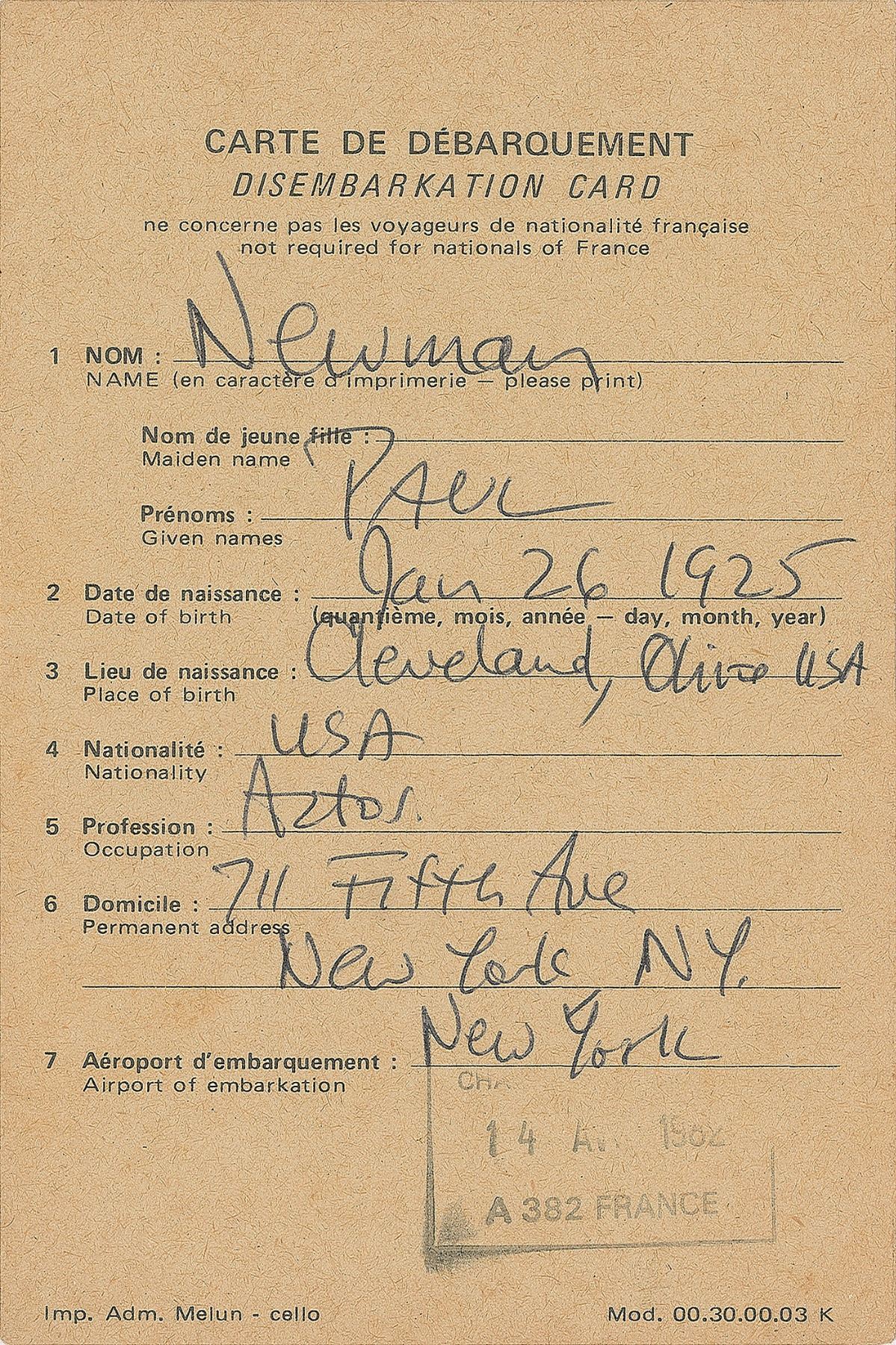 DS, one page, 4 x 6, no date but stamped April 14, 1982. French disembarkation card that Newman fills out entirely in his own hand. The various fields, as follows: Name: "Newman," Given names: "Paul," Date of birth: "Jan 26, 1925," Place of birth: "Cleveland, Ohio USA," Nationality: "USA," Occupation: "Actor," Permanent address: "711 Fifth Ave., New York, NY," and Airport of embarkation: "New York." In fine condition. The year this card was filled out, Newman was nominated for a Best Actor Oscar for his role as Frank Galvin in the film The Verdict.