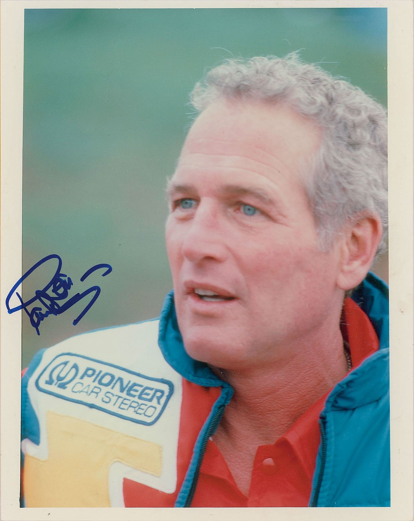 Color glossy 8 x 10 close-up photo of Newman wearing a racing jacket, signed in blue felt tip. In fine condition.