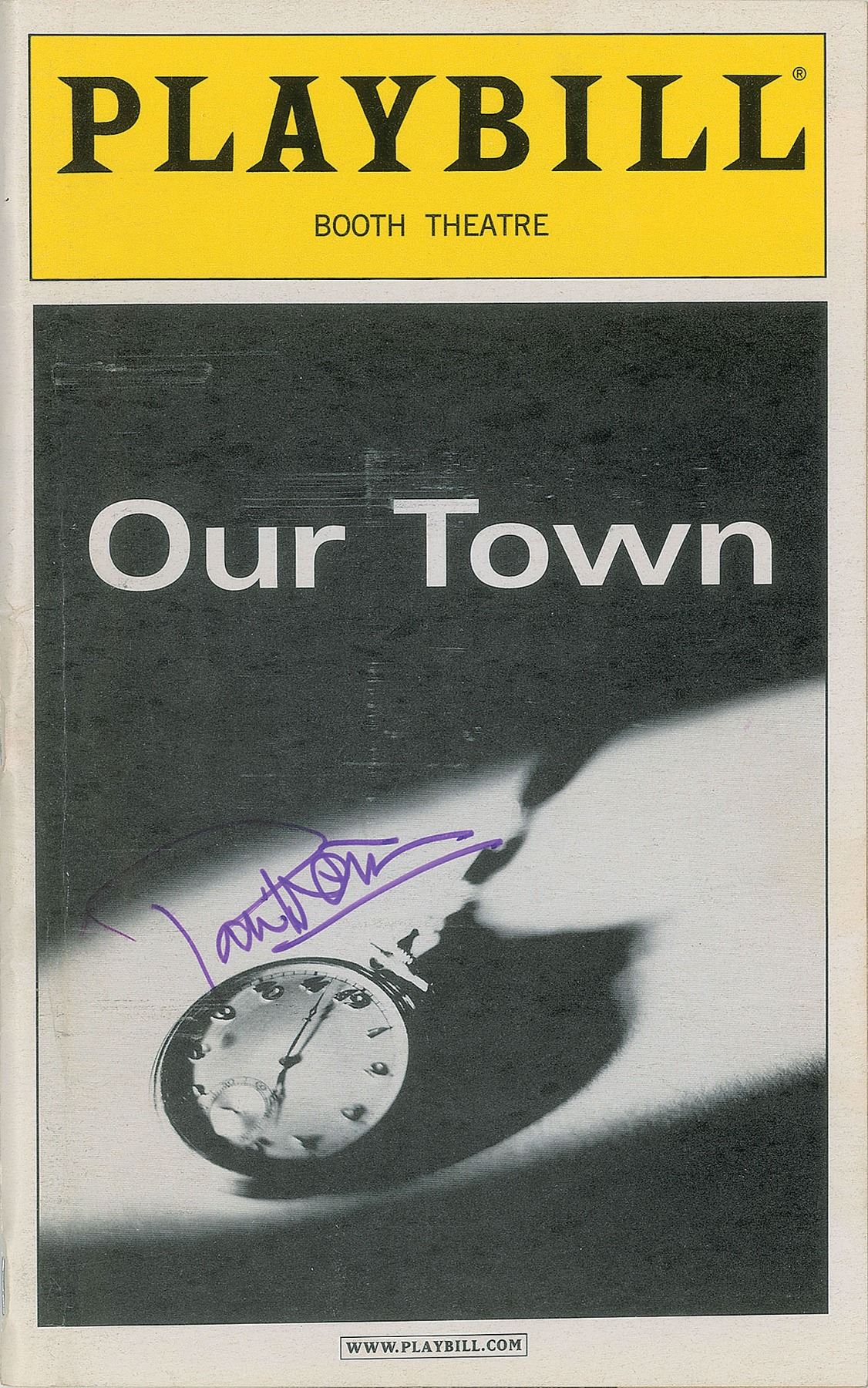 Playbill for Our Town at the Booth Theatre in December 2002, Vol. 118, No. 12, 74 pages, 5.25 x 8.5, signed on the front cover in purple felt tip by Newman. In fine condition, with light handling wear.