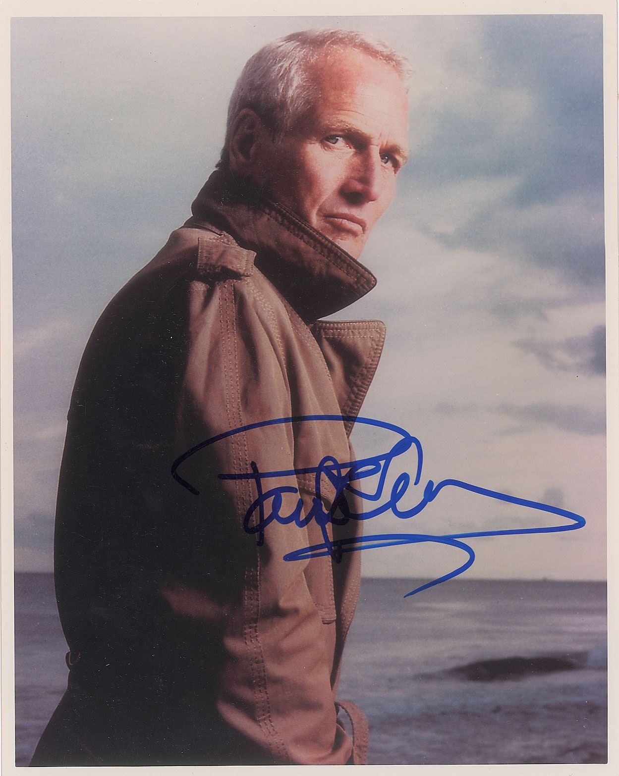 Color glossy 8 x 10 photo of Paul Newman looking over his shoulder, signed in blue felt tip. In fine condition.