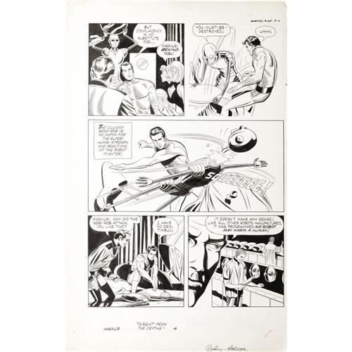 <B>Russ Manning, Paul Norris, and Mike Royer - Magnus Robot Fighter #28, page 4 Original Art (Gold Key, 1969).</B></I> It's 4000 A.D. in North Am, and man has become too dependent on his robot servants - so it is that in "Threat From the Depths," Magnus battles a renegade serv-rob. This was to be the last Russ Manning studio's <B>Magnus</B></I> story. Written and inked by Mike Royer and penciled by Paul Norris, this yarn also had Russ Manning art touches in panels throughout the story. (Mike Royer confirmed in a written note on the back of this page that Manning fully penciled the middle panel tier. Look closely -- the robot smashing, large middle panel shows the distinctive Manning approach). The approximate image area of this page is 12" x 18", and the art is in Excellent condition. Signed by Mike Royer at the lower right.<BR><BR><b>Shipping:</b> Large Flat (<a target="_blank" href="http://www.heritageauctions.com/common/shipping.php">view shipping information</a>)