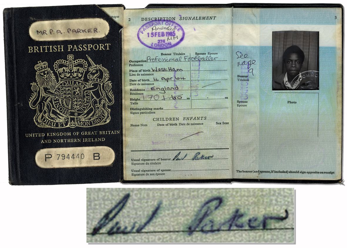 Paul Parker's passport, issued in 1980 and stamped with his travels throughout his career with Fulham and Queens Park Rangers, through 1989. Passport is signed ''Paul Parker'' and includes two photographs of the athlete - one of him looking quite youthful in 1980 and another taken for the renewal in 1985. With nearly 40 stamps. Runs 24pp. Bound in black cloth soft boards with gilt lettering. Measures 4'' x 6''. The sheets with the photos affixed have been partially laminated. Clipping to upper left corner of front cover. Wear to exterior and some buckling, warping and blurring to ink from moisture, else near fine.