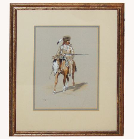Ca. 1970s, Fine signed original pen and watercolor titled "Trapper on a Horse." Very good condition. 9-1/4" x 6-1/2" (15-1/4" x 12" framed)