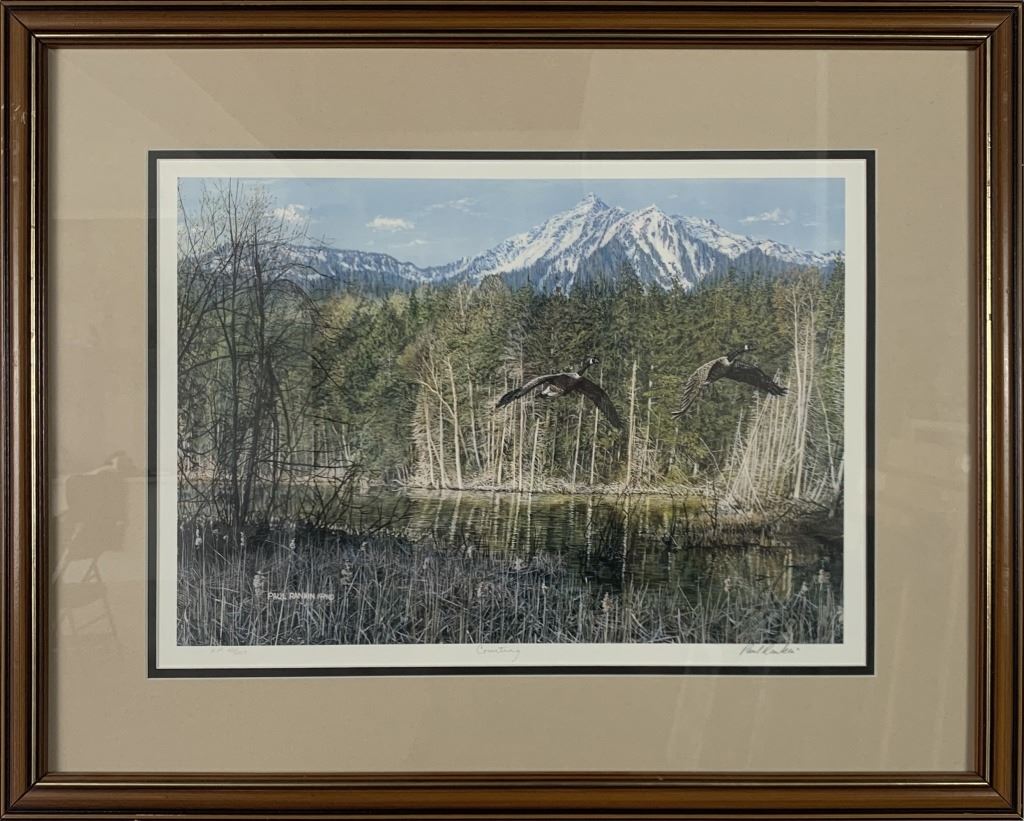 Paul Rankin's "Courting" limited edition Aritst Proof print, signed lower right, and numbered AP 50/250 lower left. This piece is of two geese in flight over a small body of water with a mountain range in the background. This piece has been professionally double matted with acid free matting, and has been custom framed under glass.