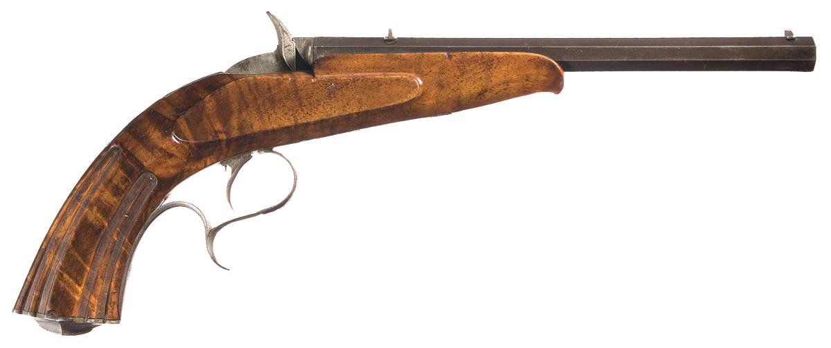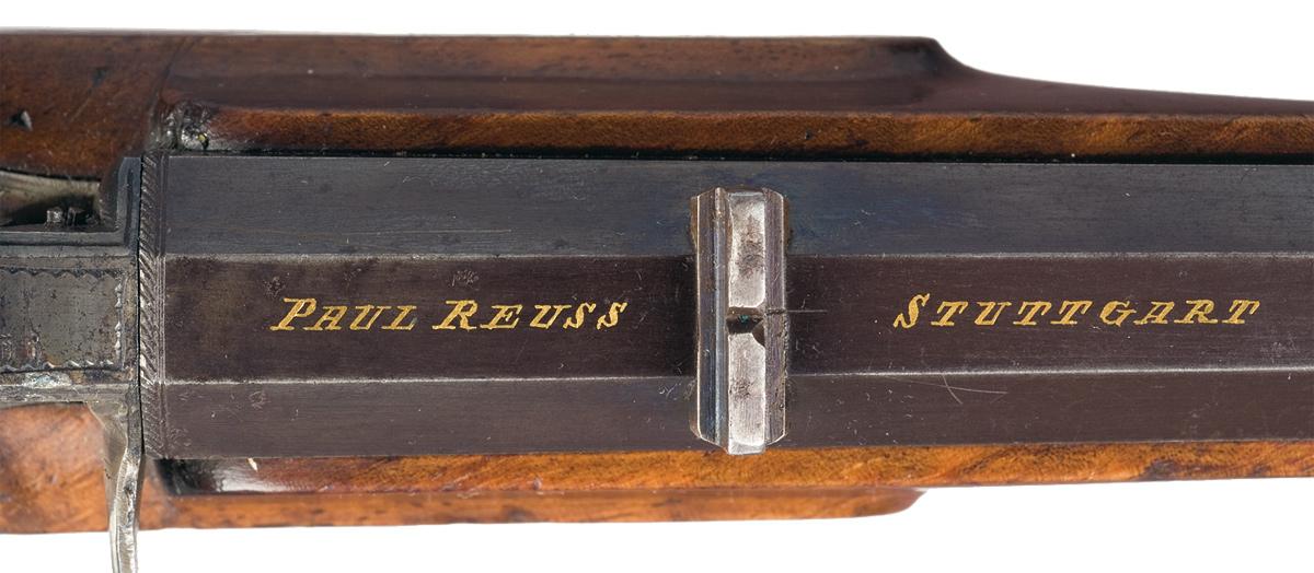 Blade and notch sights, with "PAUL REUSS STUTTGART" in gold on the top flat. Single set trigger, with border engraving on the rolling breechblock, checkered wide hammer with engraving on the back, and scroll designs on the upper tang and finger rest trigger guard. Attractive tiger stripe grain stock, with Schnabel forearm tip, ribbed grip with textured low portions, and an engraved contoured buttcap. With a number of cartridges in a RWS BB Cap tin.