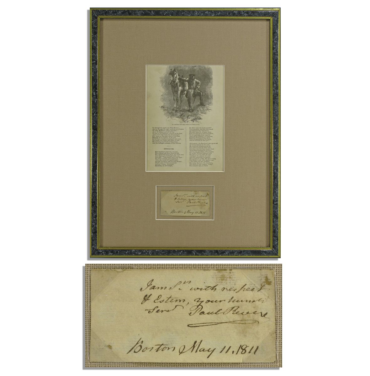 Nicely framed Paul Revere autograph noted signed, dated 11 May 1811. Note runs four lines and reads in full: ''I am Sir with respect / & Estem [sic], your humb / Servt Paul Revere / Boston May 11, 1811''. Note is framed with page 184 of the 1887 tome, ''The Poetical Works of Henry Wadsworth Longfellow'', in which the last portion of Longfellow's ''Paul Revere's Ride'' poem appears along with an illustration of Revere and his horse, captioned ''He watched with eager search the belfry tower.'' Note measures 3.25'' x 1.75'' and poem measures 6'' x 9.5''. Minor toning, else near fine.