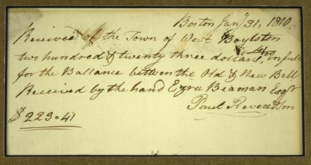 Rare Paul Revere receipt signed fully in his hand, datelined Boston, 31 January 1810. In full, ''Receives of the Town of West Boylston two hundred & twenty three dollars 41/100, in full for the Ballance between the Old & new Bell received by the hand of Ezra Beaman Esqr / $223=41 / Paul Revere & Son.'' Revere and his sons produced many church and meeting house bells in a nearly forty-year period between 1792 and 1828, and many still hang in buildings throughout New England and beyond. Nothing is known about the fate of this particular bell, but it may lie at the bottom of the Wachusett Reservoir as most of the town of West Boylston was submerged by its construction in 1908. Single page measures approximately 9'' x 5''. Light marginal toning and vertical creasing, and contemporary ink smudge, else fine condition.