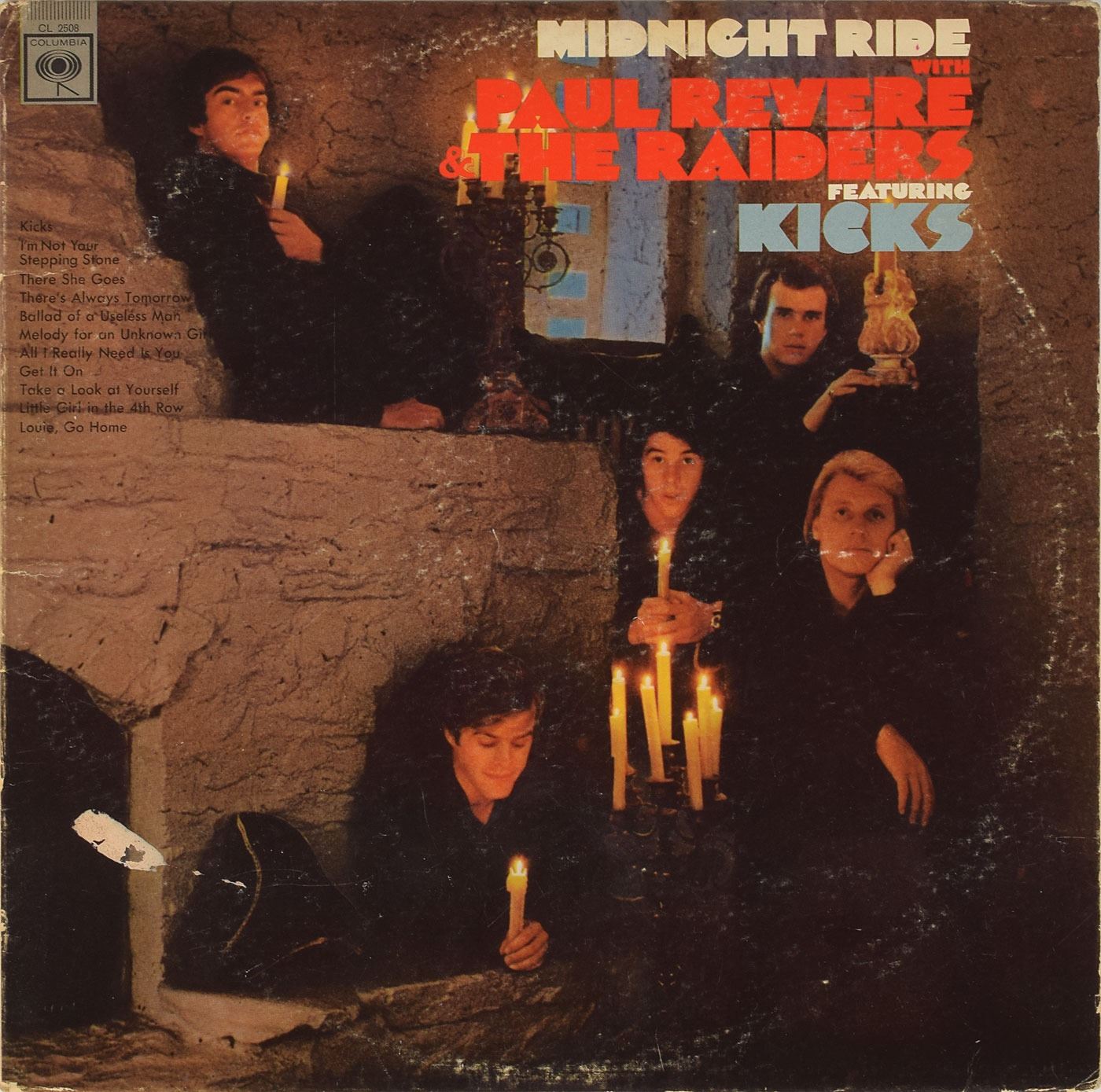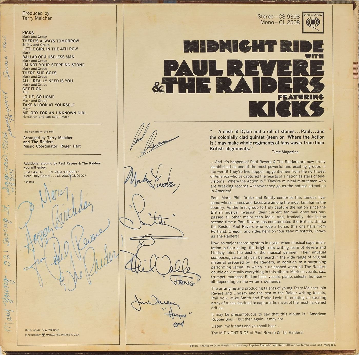 Midnight Ride album signed on the reverse in black felt tip by Paul Revere, Mark Lindsay, Mike 'Smitty' Smith, Phil 'Fang' Volk, and Jim 'Harpo' Valley. Also inscribed in another hand with a birthday message, and annotated along the left edge with the recipient's name and address. In very good to fine condition, with light scuffing and brushing to signatures. The record is included.