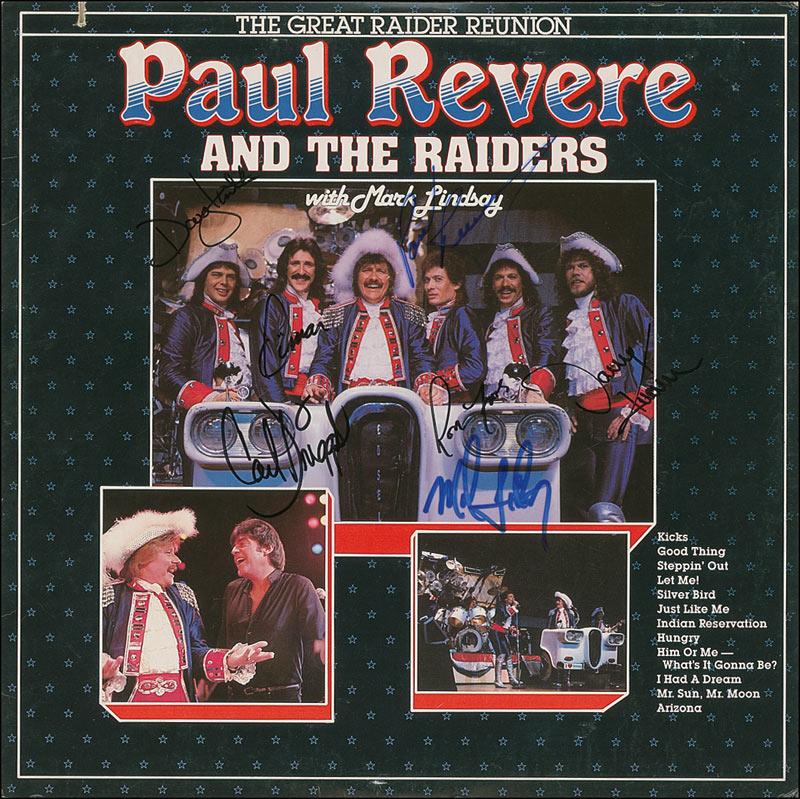 The Great Raider Reunion album signed in blue or black felt tip by Paul Revere, Mark Lindsay, Omar Martinez, Carlo Driggs, Ron Foos, Doug Heath, and Danny Krause. In fine condition with a small cut at the top border. The record is included.