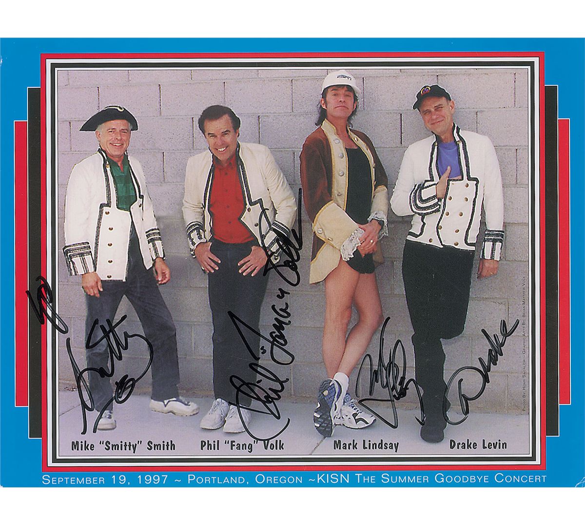Color 11 x 8.5 cardstock group photo from 1997, signed in black felt tip by Mike ‘Smitty’ Smith, Phil ‘Fang’ Volk, Mark Lindsay, and Drake Levin. In fine condition, with a few small creases to corner tips and edges.
