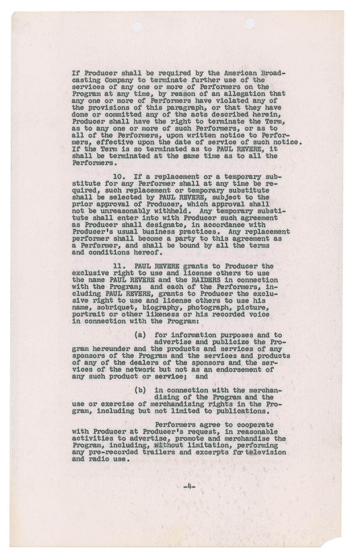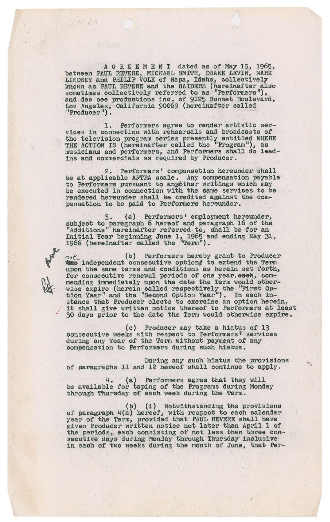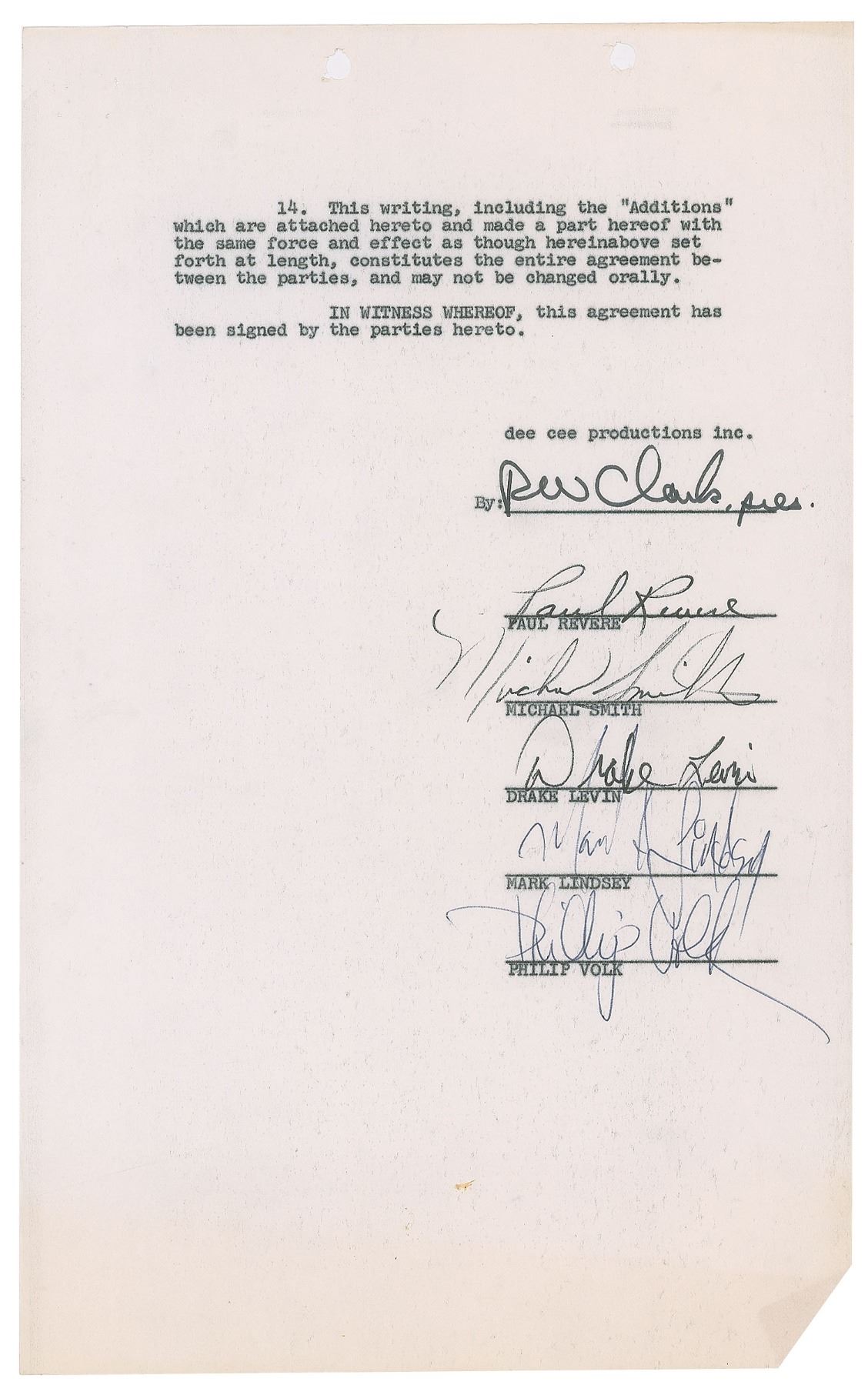 DS, six pages, 8 x 13, May 15, 1965. Agreement in which the band agrees "to render artistic services in connection with rehearsals and broadcasts of the television program series presently entitled Where The Action Is…as musicians and performers, and Performers shall do lead-ins and commercials as required by Producer." Signed at the conclusion in black ink by Paul Revere, Michael Smith, Drake Levin, Mark Lindsay, and Philip Volk. In fine condition.