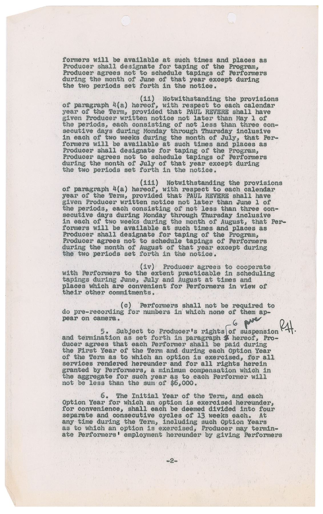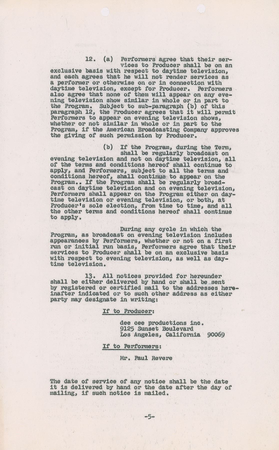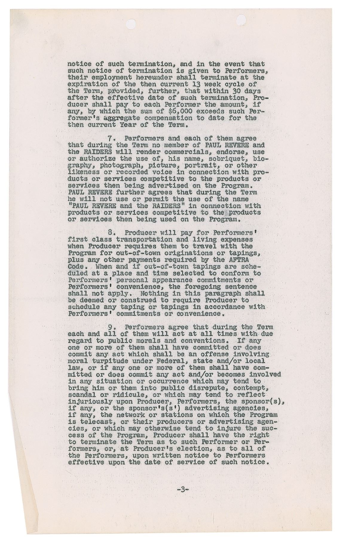 DS, six pages, 8 x 13, May 15, 1965. Agreement in which the band agrees "to render artistic services in connection with rehearsals and broadcasts of the television program series presently entitled Where The Action Is…as musicians and performers, and Performers shall do lead-ins and commercials as required by Producer." Signed at the conclusion in black ink by Paul Revere, Michael Smith, Drake Levin, Mark Lindsay, and Philip Volk. In fine condition.