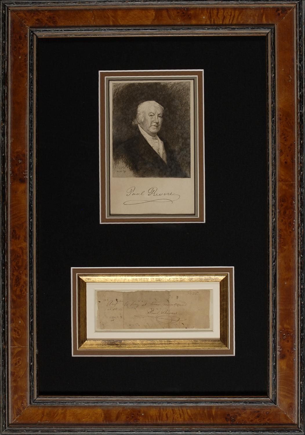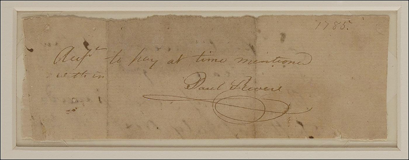 American patriot and metalsmith (1735–1818) whose 1775 “Midnight Ride” to warn of an impending British invasion later became one of the most celebrated incidents of the Revolutionary War. Rare partial self-contained ADS, one page, 5 x 1.75, dated at the top in another hand “1785.” Brief document reads, “Acct to pay at time mentioned within,” and signed at the conclusion “Paul Revere.” Nicely double matted and framed with a portrait of Revere, to an overall size of 14 x 20.25. In very good condition, with two vertical folds, one through a single letter of signature, scattered light toning and soiling, two rough edges, and show-through from writing on reverse. Following the war, Revere set his sights on silver work, opening an iron and brass foundry in the North End of Boston. One of early American history’s most sought after autographs.