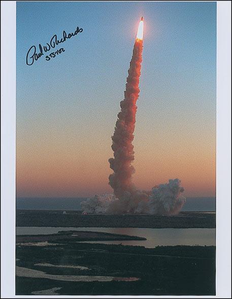 Color laser-print 8.5 x 11 photo of a space shuttle launch against a glorious sunrise, signed in black felt tip, “Paul W. Richards, STS-102.” In fine condition, with trivial surface creasing.