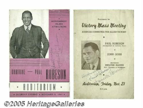 <B>Paul Robeson Signed Programs.</B></I> Two programs for live performances by baritone Paul Robeson, one dated November 21, the other November 8, 1941, both signed by the singer in black ink. Both are in very good condition with some creasing, cover soiling and slight cover discoloration. <I>With COA from PSA/DNA.</B></I>
