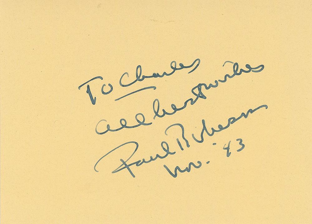 Vintage fountain pen signature and inscription, “To Charles, all best wishes, Paul Robeson, Nov. ‘43,” on an off-white 5.5 x 4 album page. In very fine condition.