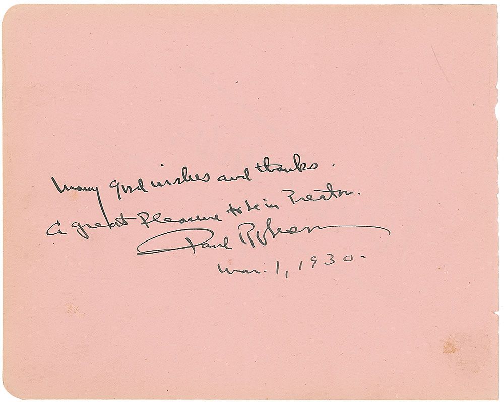 Vintage fountain pen signature, “Many good wishes and thanks. A great pleasure to be in Preston. Paul Robeson, Mar. 1, 1930,” on a light pink 7.5 x 6 album page. Mild toning to borders and light scattered creases and soiling, otherwise fine condition.