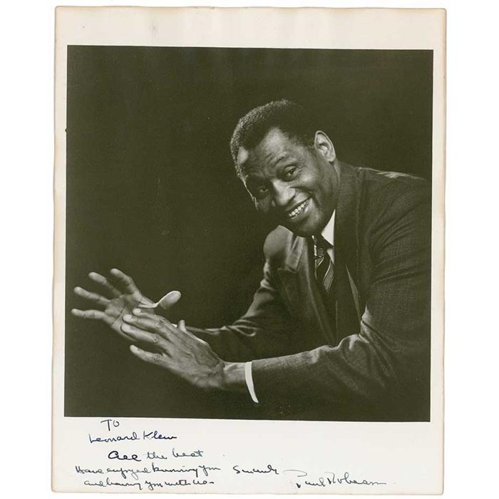 Vintage matte-finish 8 x 10 photo, signed and inscribed in fountain pen “To Leonard Klem, All the best, have enjoyed knowing you and having you with us—Sincerely, Paul Robeson.” Mild rippling to all four edges, otherwise fine condition. Pre-certified PSA/DNA and RRAuction COA.